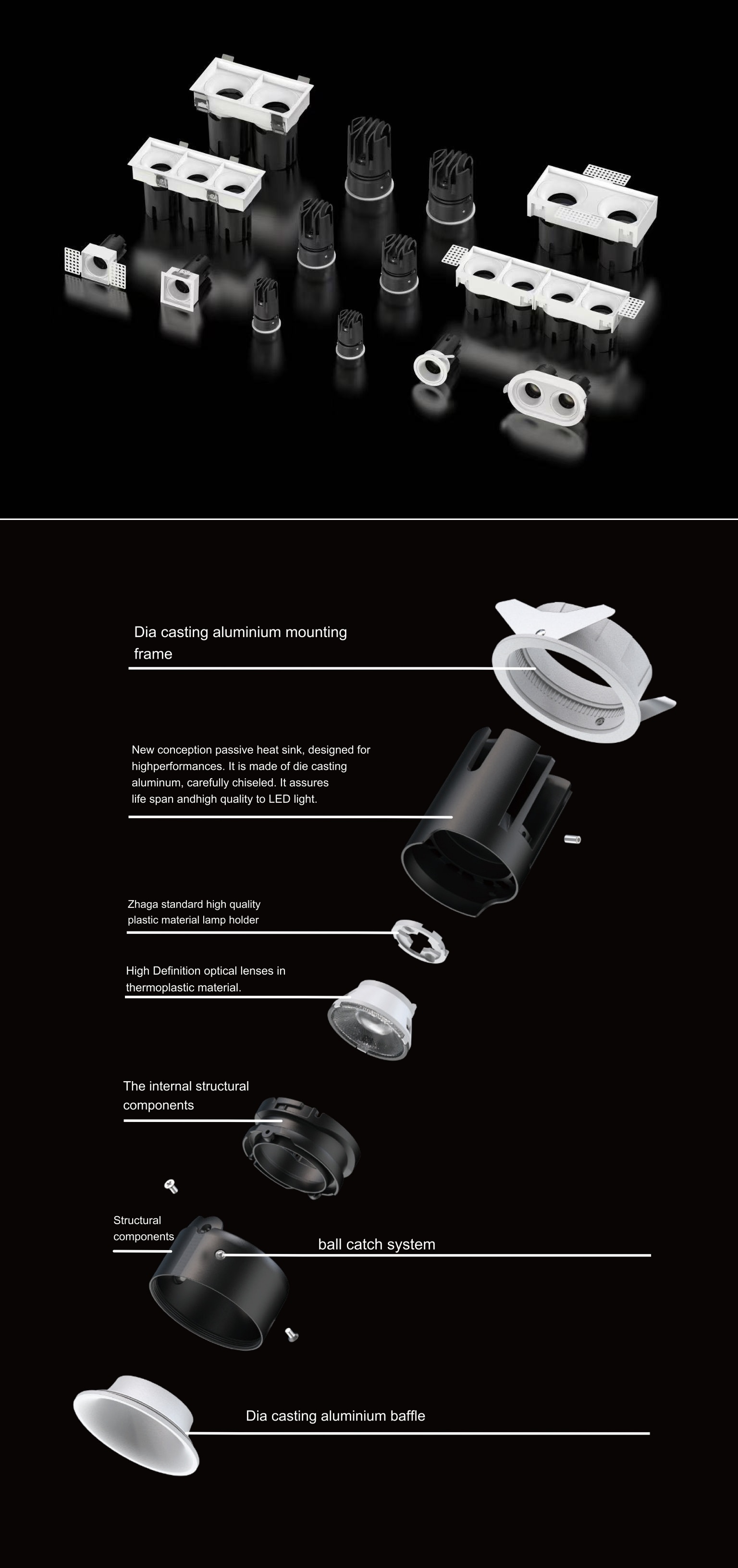 Aluminium material and powder coating. Remote LED driver version. IP44. Visual comfort. High Efficiency upto 100lm/W. Modular Design,they comprise a LED light module, a metal secondary reflector and a metal mounting frame. the reflector is available in multiple color finishing. The lighting fixture is fixed, Easy installations. it facilitates the installation by giving the opportunity to the installer to place the mounting frame in advance. No need to worry for the lighting modules in further finishing of the room, as the ball catch system installation,spotlight modules can be pushed into the mounting frame afterwards, and easy to take it off the mounting frame. very easy to handle. The spotlight offer homogeneous and uniform light distribution, available for four different output beams 15/24/36/55°. Specialized optics and optical filters can be ordered. Dimmable. 5years warranty. Customized color finishing, power changes are possible depending on the request and the quantity. Ideal solution for accent lighting of the medium to high end projects, mainly suitable for Hotel, Villa, Apartment, Restaurant, etc.