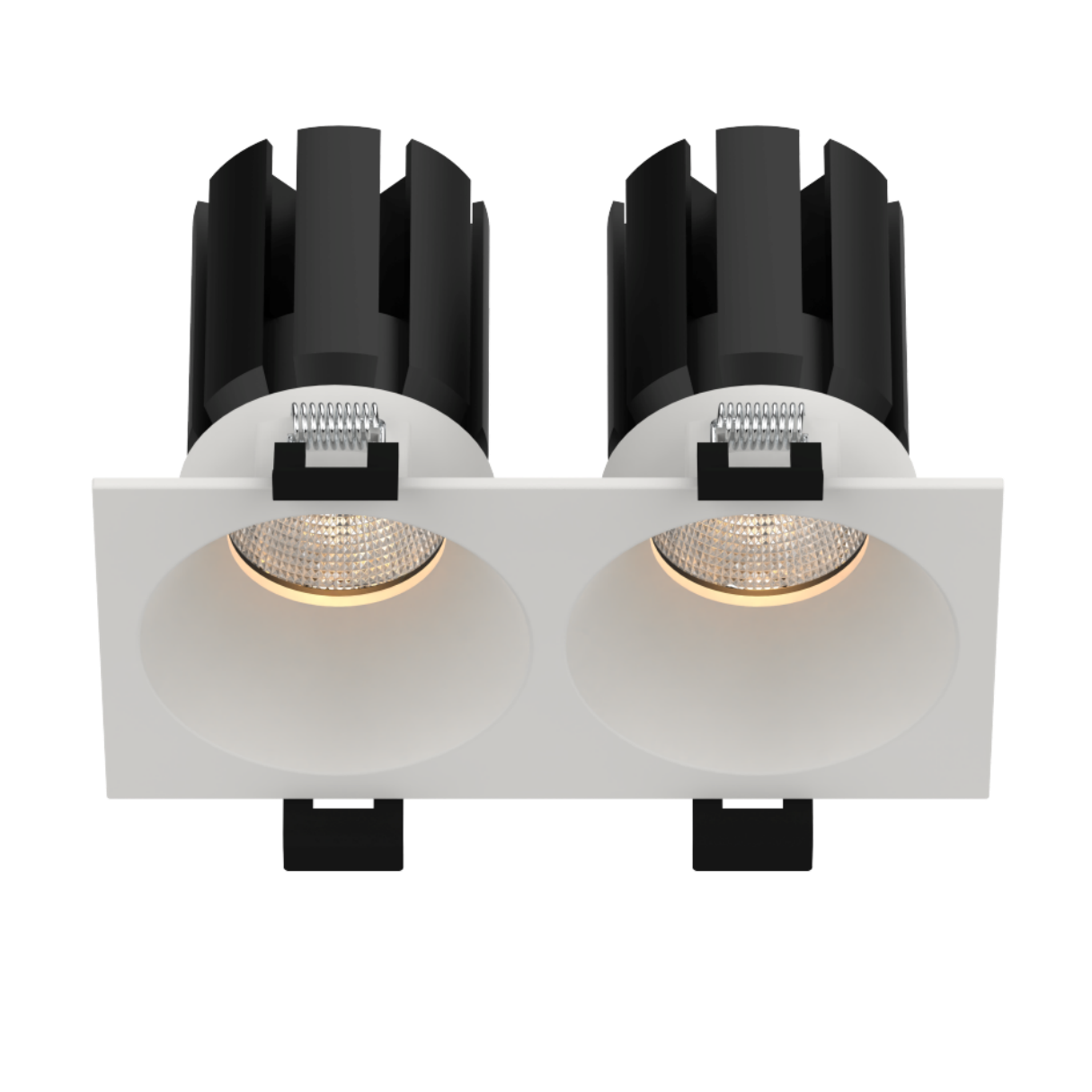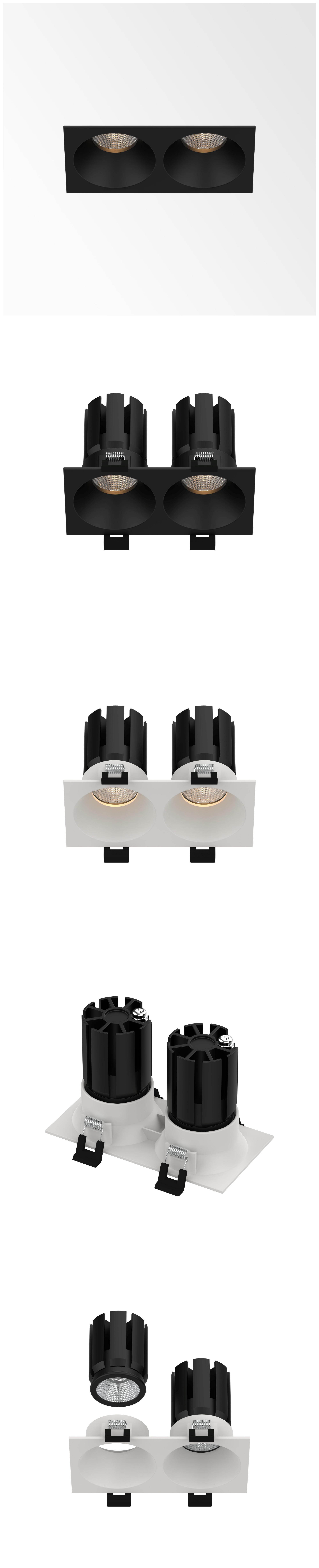 Double spotlight, fixed, recessed light source. Luminaires in this line have modular design. They comprise a LED light module and a metal mounting frame. One housing achieved multiple options and different light distributions for a wide varirty of applications, the new creating that meets the needs of your residential and commercial projects. The spotlight offer homogeneous and uniform light distribution. deep cut-off angle 45°. easy installations. High Definition optical lenses in thermoplastic material. Specialized optics and optical filters can be ordered. 5years warranty. Flicker-Free. The standard product comes in RAL 9005 Black color finishing I RAL 9016 White color finishing. On the request it can be offered in any RAL colour, matching the specific look and feel of your design. Moreover, the IP54 means that they can be used even in bathroom or other damp indoor locations. This enables you to continue the ceiling uniformity throughout bathrooms, wellness areas and other indoor damp locations. Excellent colour rendering , it's perfect for a wide range of food, flowers, clothes, and in general for other display lighting applications. High-quality mixing effect achieved. White and bright to warm and dim, tunable white gives character to it's environment. The light spot are remain the same while the color change, and there is almost no effect on the light spot. The edge is cut off, the outline of the time spot range is clearly visible when washing the wall, and the interior is uniformly transitioned. Achieve a pleasing and soft effect of the wall washing spot. Dimmable.