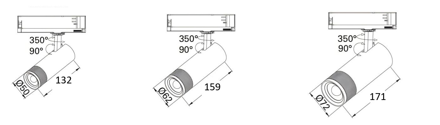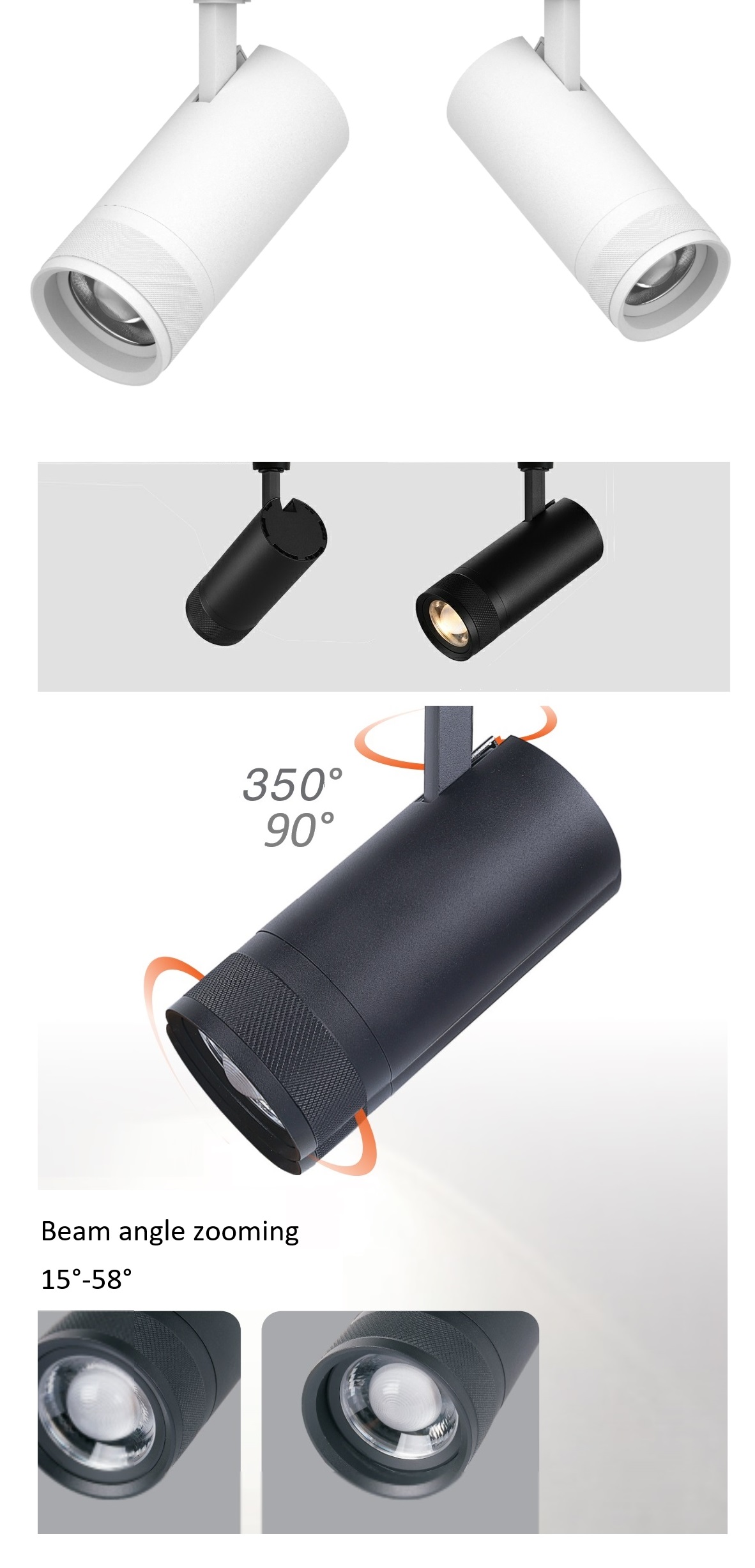 Aluminium extrusion material and powder coating. -In-track LED Driver Trackspotlight. DALI dimmable version Beam angle zooming version, Double adjustability 90°adjustable 355°rotation, ZOOMLENS 15°-58° An ideal accent lighting in residential or commercial. -High level of visual comfort, the high performances and flexibility for every project. High Definition optical lenses in thermoplastic material. -Uniform distribution. White OR Black color finishing as standard. -- Customized power changes are possible depending on the request and the quantity. -On the request it can be offered in any RAL colour, matching the specific look and feel of your design. (DALI 1-phase 4 wires trackspotlight)