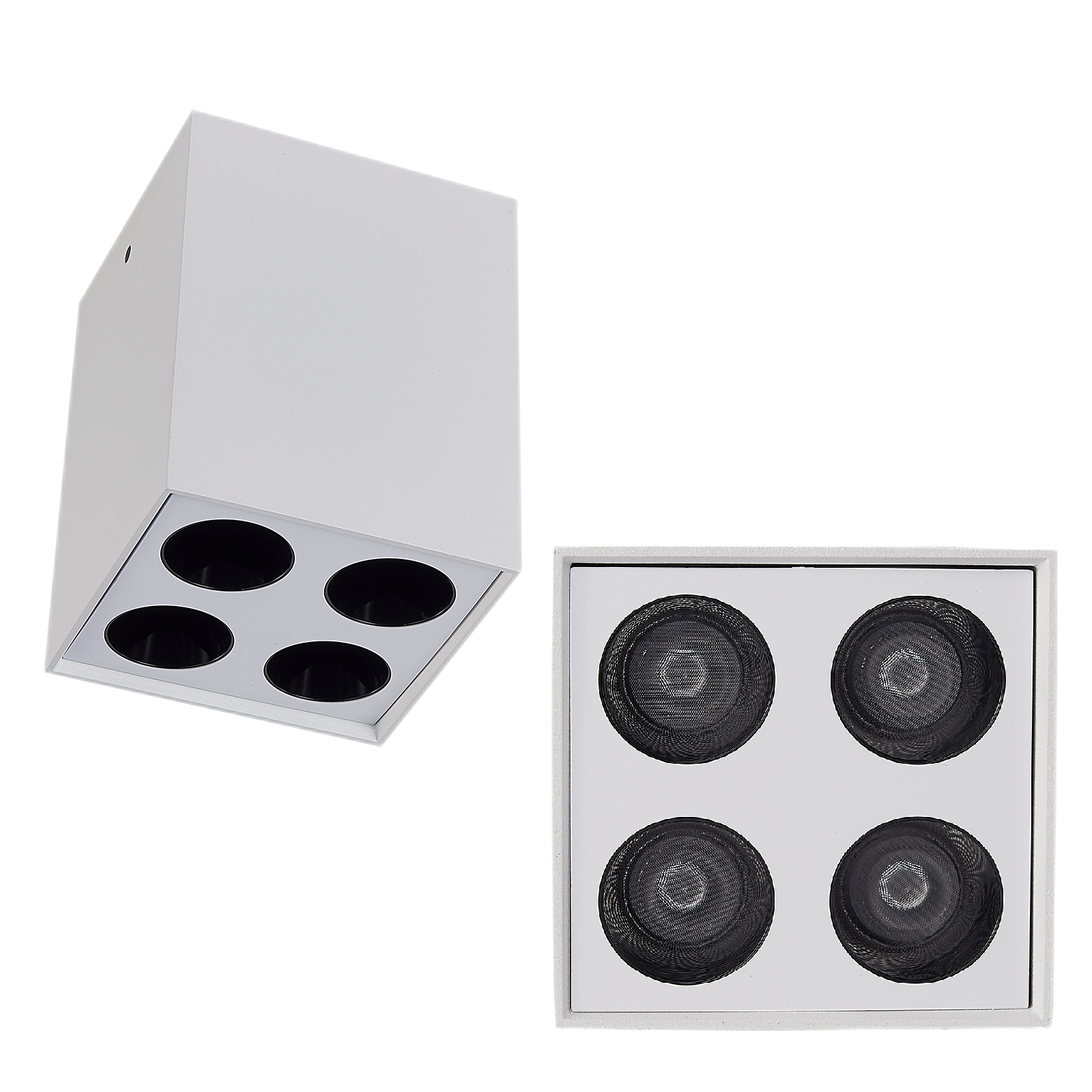 Fixed spot, an ideal accent lighting in residential or commercial areas. ABS baffle. One housing, multiple options, with different light distributions for a wide varirty of applications. Easy installations. Visual comfort low glare optic with recessed light source. UGR<19. High Definition optics. -Uniform distribution. 4LEDs, OSRAM CRI90 2W/LED RAL9016 White I RAL9005 Black color finishing as standard. Customized color finishing, power changes are possible depending on the request and the quantity. It is presented to its customers as a clean and non-dazzling product.